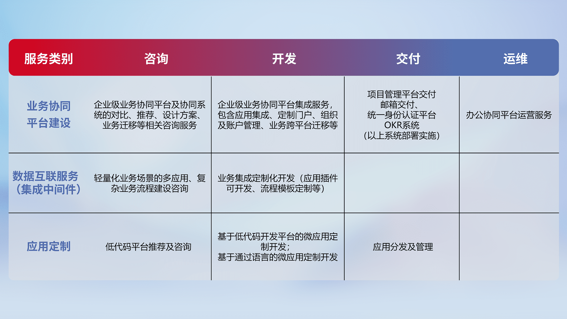 针对钉钉、、、企微、、IDaas等平台级产品提供产品的规划、、、、方案、、、交付、、、定制化开发等服务,,,实现如统一协同办公、、智能客户服务、、混合会议管理、、、、智能数据查询、、、等业务场景,,实现数字化转型。。。。
